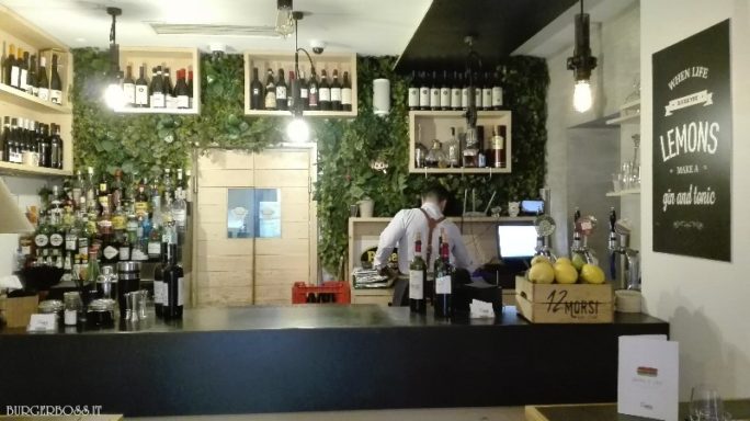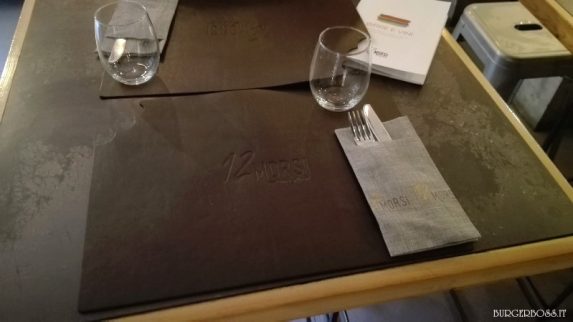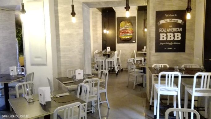 Il locale ha uno stile molto moderno. I tavoli sono apparecchiati con tovagliette in cuoio “morse” sull’angolo in alto a sinistra e con il logo “12 Morsi”, presente anche sul sacchettino che contiene le posate. Bellissimi i grembiuli del personale in sala e al bancone realizzati in jeans e con cinture di cuoio. E’ palese un’attenta cura del dettaglio che favorisce a creare un’atmosfera da hamburgeria d’élite.