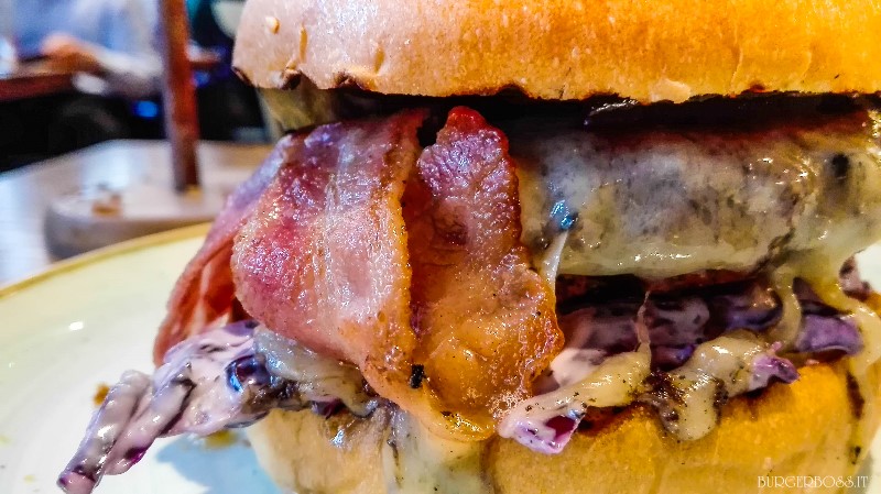La carne ha il grado di cottura richiesto, è cotta in modo uniforme ed è davvero buona: niente da dire. Il bacon è buono ma non proprio croccantissimo. Purtroppo, contrariamente a quanto speravo, non ho avvertito la nota affumicata del formaggio: peccato. L’insalata e i cetriolini rinfrescano il tutto e completano il panino alla perfezione.