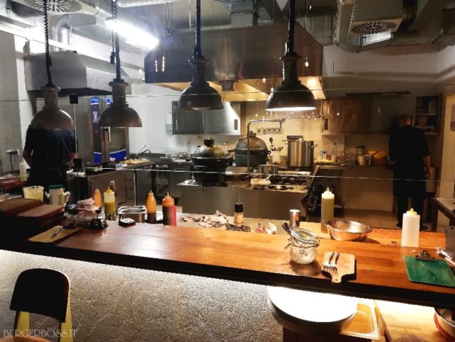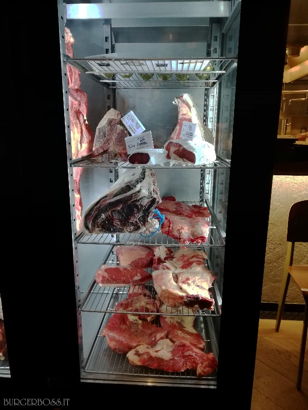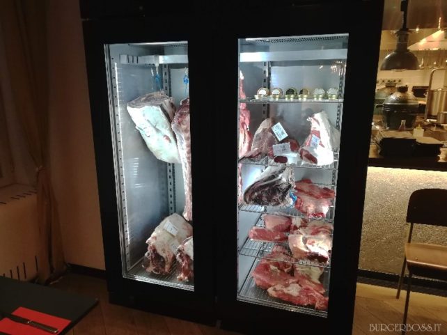 Il locale non è molto grande, forse una quarantina di coperti, il che rende l’ambiente molto più intimo. I punti forti della sala sono sicuramente la cucina a vista, in cui spiccano due Big Green Eggs (barbecue in ceramica che permettono di cuocere e affumicare la carne a bassa temperatura e per molte ore) e i frigoriferi che somigliano più a vetrine di una boutique di lusso nei quali sono in bella mostra splendidi tagli di carne.