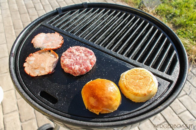 Cottura: scaldate una piastra o una padella sui fornelli della cucina o sul barbecue. Mettete in cottura il patty e salatelo. Passate sulla piastra di cottura anche le fette di mortadella e le due metà del bun che avrete precedentemente imburrato.