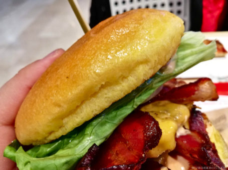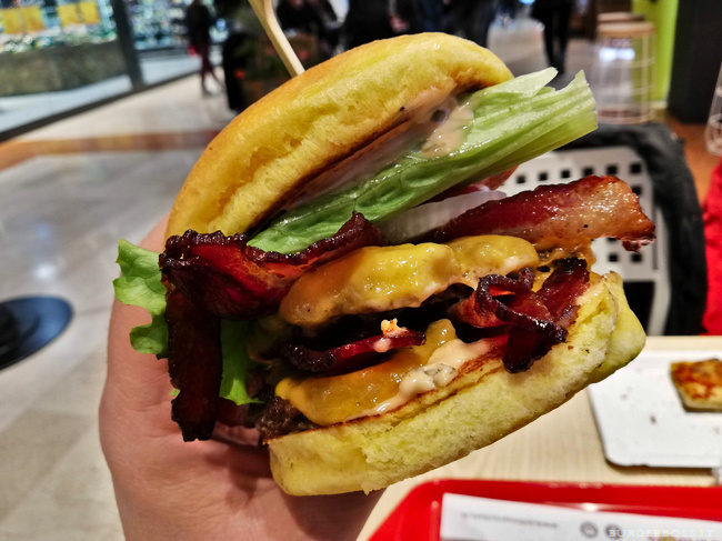 Passiamo adesso al pezzo forte, l’hamburger. Non resisto, così la prima cosa che faccio appena il tizio dietro al bancone mi passa il vassoio è quella di dare una rapida palpatina al pane: wow… è davvero soffice! L’aspetto, poi, non è niente male con i patty che presentano un’invitante crosticina, il bacon che appare croccante, il formaggio ben fuso e le verdure che sembrano davvero freschissime.