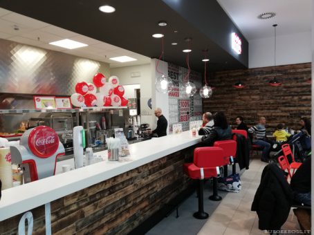 Il ristorante si trova nell’area food di un centro commerciale (Centro Commerciale Porte dell’Adige a Bussolengo – VR) e più che possedere un vero e proprio locale, ha uno spazio dedicato, con alcuni tavoli e un bancone con qualche sgabello, ma l’ambiente è aperto e si affaccia su uno spazio condiviso con gli altri punti di ristorazione. Questo, purtroppo, rovina l’atmosfera da ambientazione anni ’50 che caratterizza il franchise.